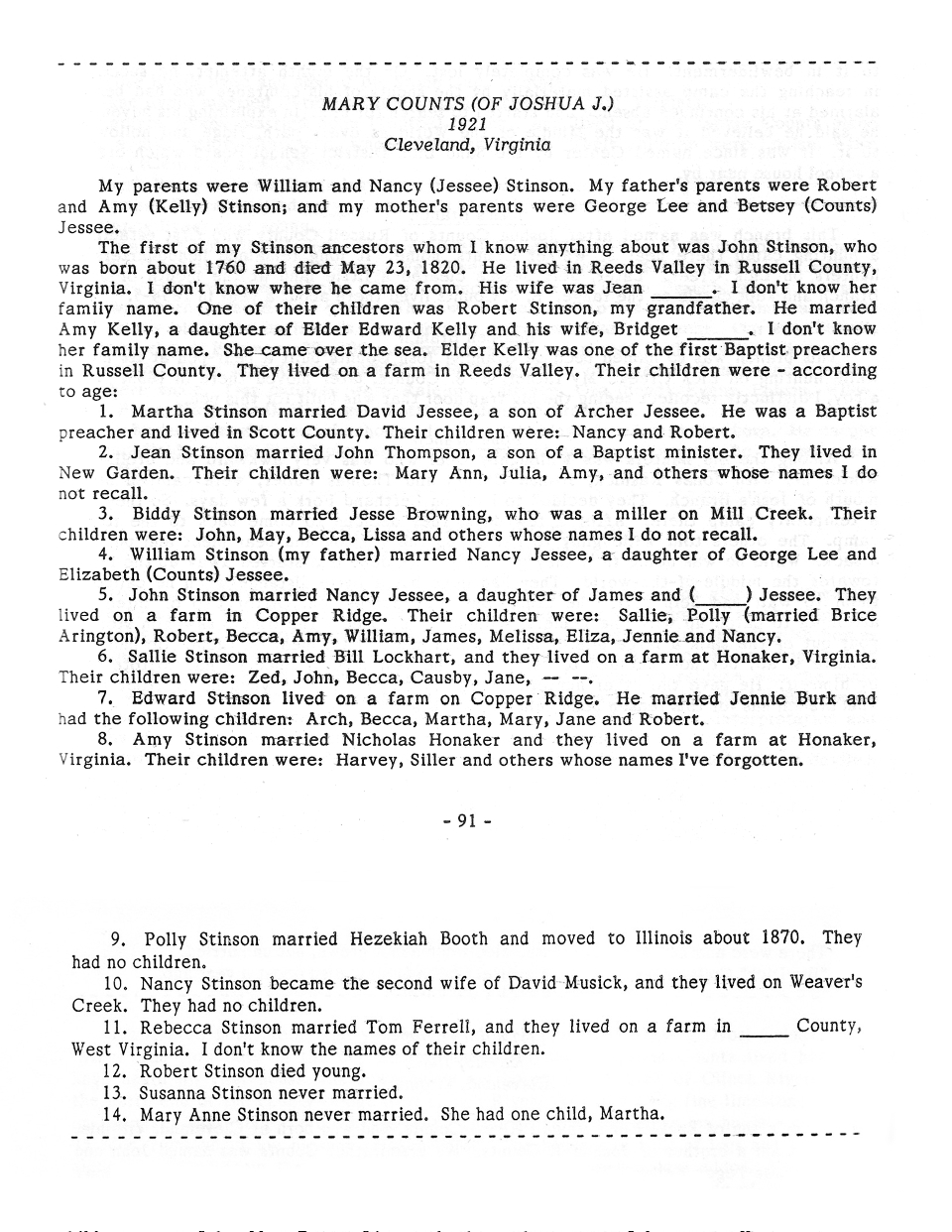 These excerpts were taken from the book, Pioneer Recollections of Southwest Virginia, pg 91-92. It refers to the Counts, Stinsons, and Kellys who lived in Reeds Valley, VA.